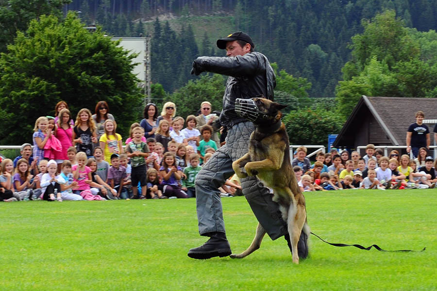 Die Kinder der VS 1 und der VS 2 aus St. Veit sowie die SchülerInnen der VS Hörzendorf konnten sich im Zuge dieser Veranstaltung selbst ein Bild davon machen, wie schmal der Grat zwischen dem liebenswerten Spielgefährten und der Unberechenbarkeit von sich bedroht fühlenden Hunden sein kann. Rund 500 SchülerInnen beobachteten die Vorführung der Polizei und lernten dabei mögliche Gefahren und die Körpersprache unserer vierbeinigen Freunde kennen.